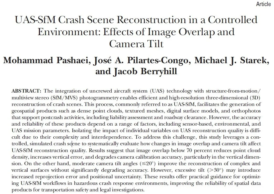 Former MANTIS Ph.D. student and post-doctoral researcher recently published an article in the Journal of Surveying and Land Information Science (SALIS) titled “UAS-SfM Crash Scene Reconstruction in a Controlled Environment: Effects of Image Overlap and Camera Tilt.” The paper explores how key photographic flight parameters, specifically image overlap and camera tilt, affect the quality of 3D reconstructions of crash scenes using UAS-SfM workflows. The work was conducted in a controlled environment to simulate crash-scene conditions while allowing systematic variation of parameters.